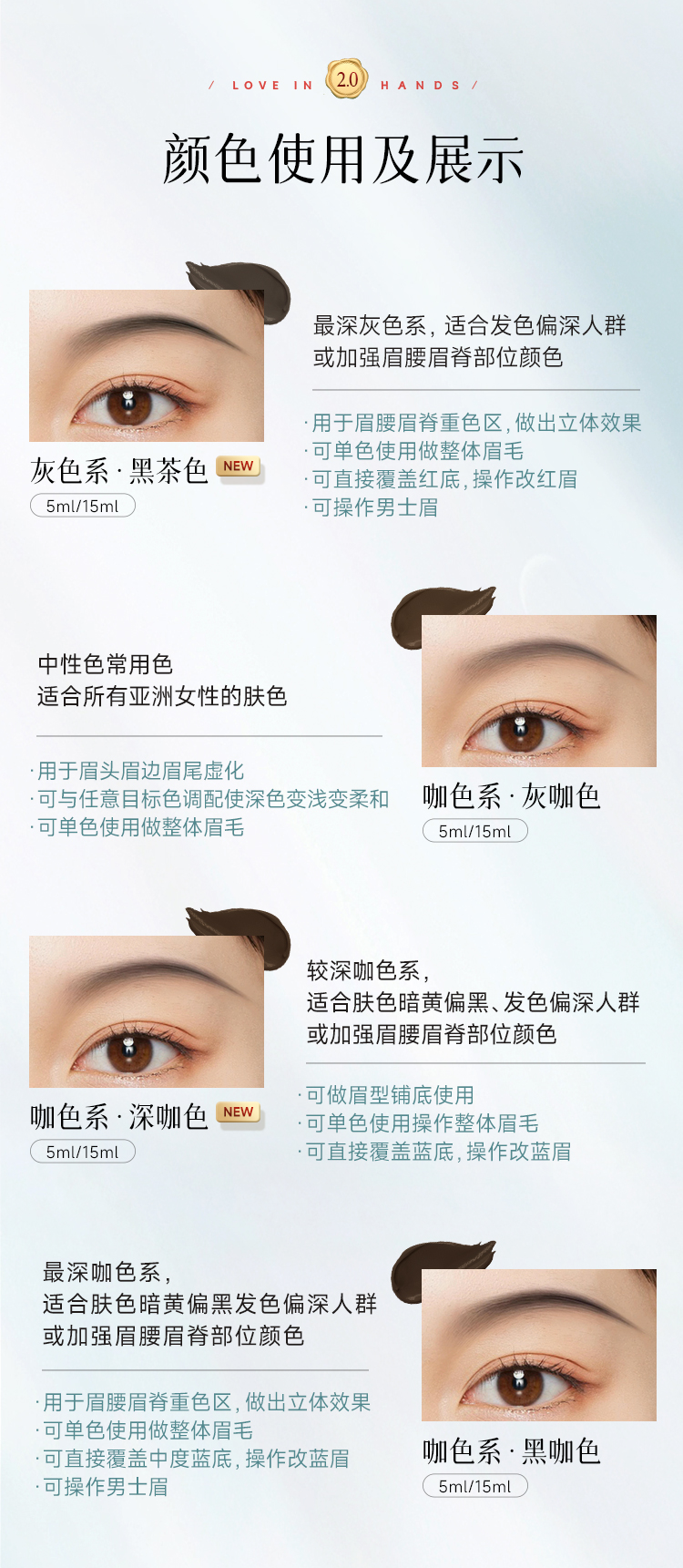 使用前请摇匀。清洁眉部周围肌肤,取适量产品涂抹于需要修饰的部位,可单独使用,也可与本品牌其他色乳调配使用